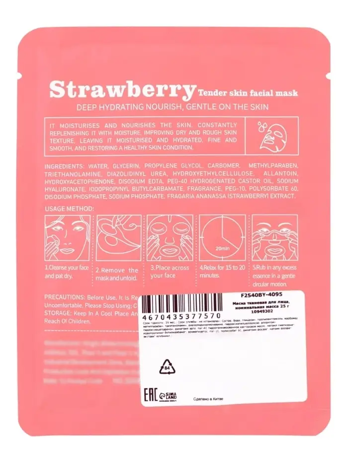 Тканевая маска с экстрактом клубники — это интенсивный уход и моментальное увлажнение кожи в удобном формате. Лёгкая сыворотка с активными компонентами глубоко питает и увлажняет кожу, помогает восстановить естественный уровень влаги, делает кожу более мягкой, гладкой и ухоженной. Маска обеспечивает приятное освежающее ощущение и подходит для быстрого ухода перед важными событиями или в конце дня.