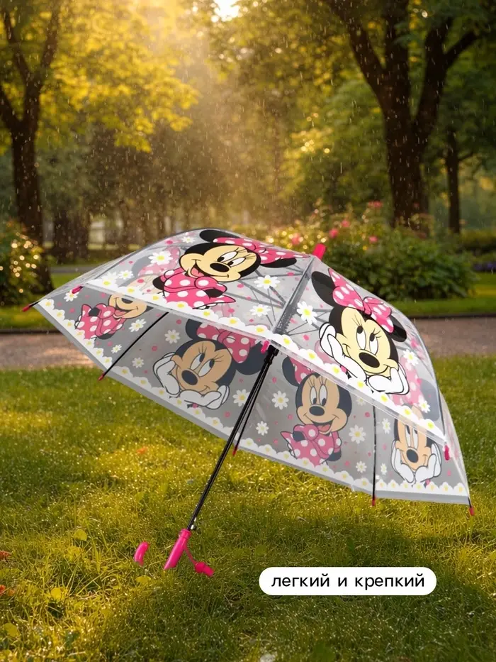 Прозрачный купол обеспечивает хорошую видимость в дождь. Ручка из прочного пластика с удобным хватом. На куполе — яркий принт с героями любимого мультфильма. Подходит для детей от 3 лет.