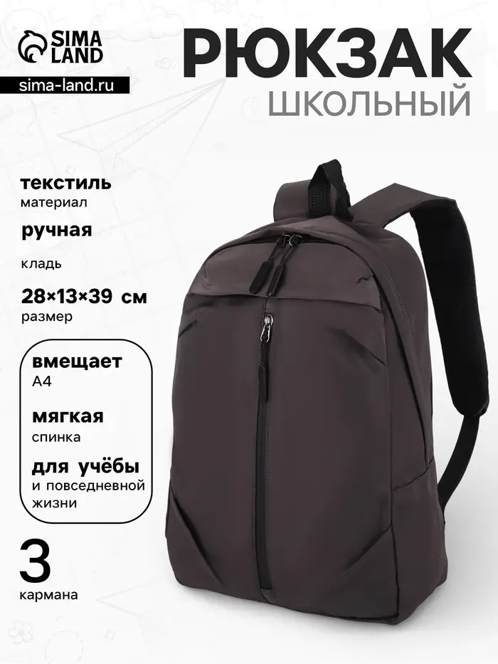 Рюкзак школьный, однотонный, 1 отделение, 3 кармана, 28×13×39 см, серый
