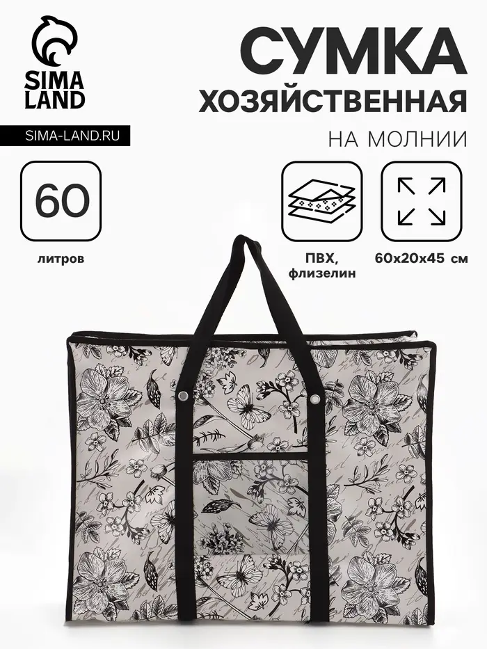 Сумка хозяйственная «Цветы и бабочки», на молнии, 60×20×45 см, наружный карман, серая