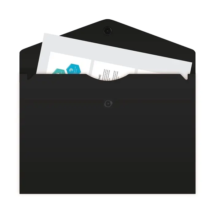 С папкой-конвертом на кнопке Calligrata формата А5 все важные документы будут под надёжной защитой. Стильный черный цвет. Папка плотно закрывается на кнопку, которая рассчитана на ежедневное использование. Папка-конверт размером 250 х 169 мм и толщиной 150 мкм изготовлена из пластика, который защищает изделие от сминания и других повреждений.
