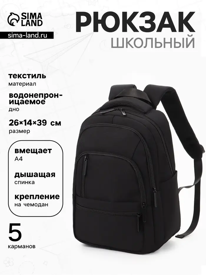 Рюкзак школьный, 2 отделения, 5 карманов, водонепроницаемое дно, 26×14×39 см, чёрный