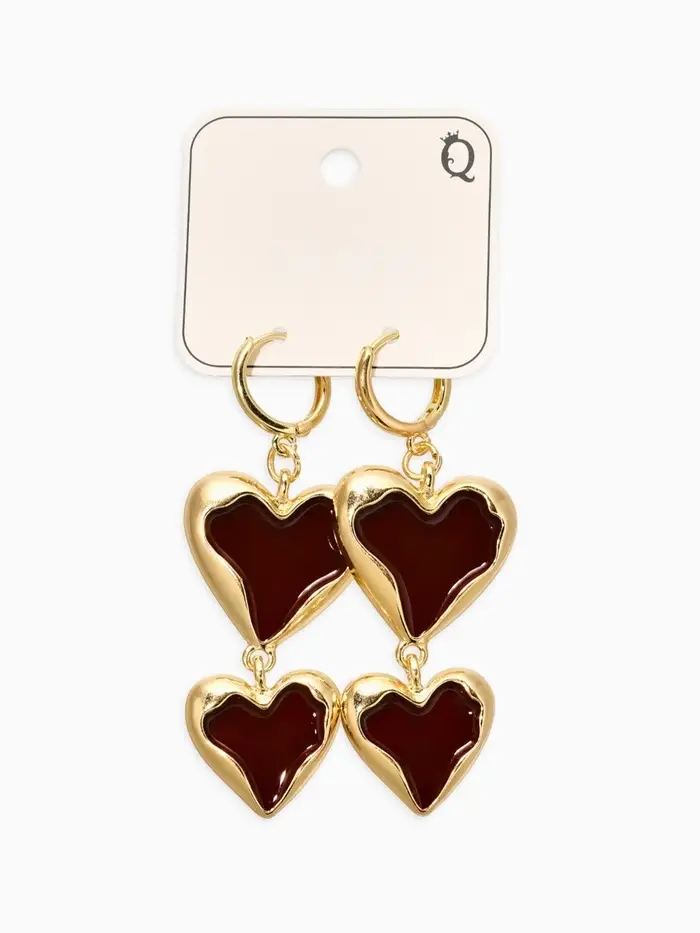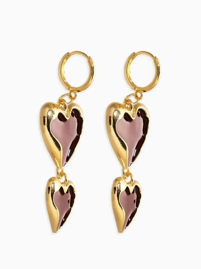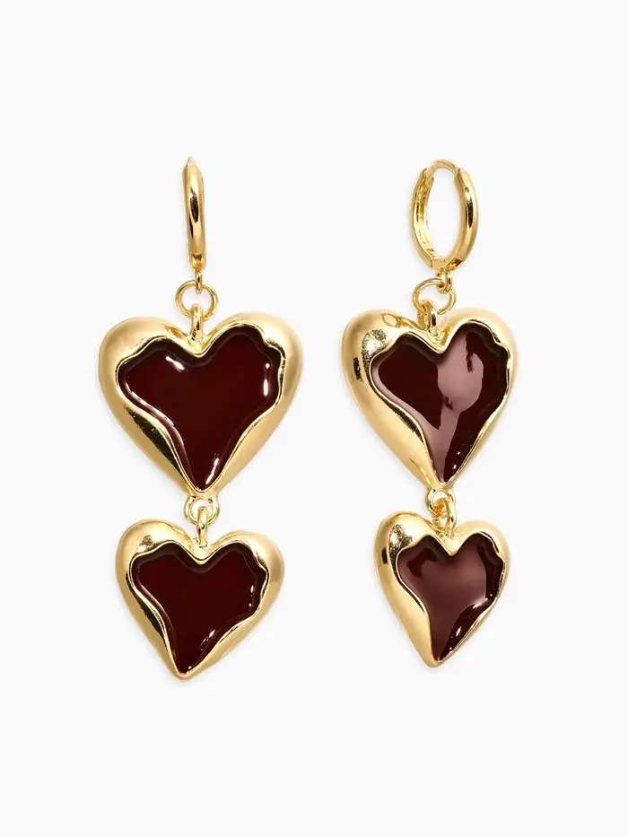 Серьги "Два сердца" корейский стиль, цвет красный в золоте