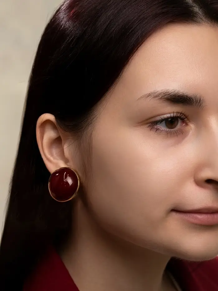 Глубина бордового оттенка в этих серьгах из акрила поражает своей насыщенностью и благородством. Изысканная золотистая фурнитура не просто дополняет дизайн, а создаёт выразительный контраст, превращая аксессуар в настоящее украшение для ценительниц ярких деталей с утончённым вкусом.