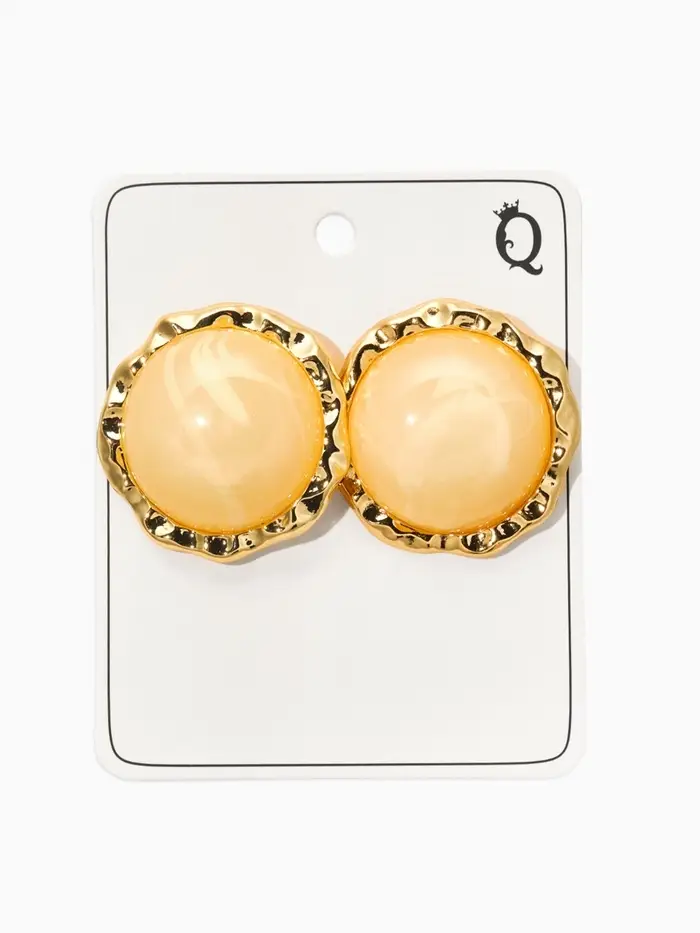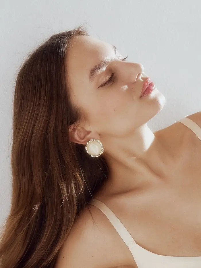 Мягкий бежевый оттенок акриловой вставки в форме идеального круга гармонично вписан в изящную золотистую рамку, создавая аксессуар с тонким чувством стиля и природной элегантностью. Этот аксессуар легко впишется как в дневной, так и в вечерний образ, подчеркивая женственность и утончённость.