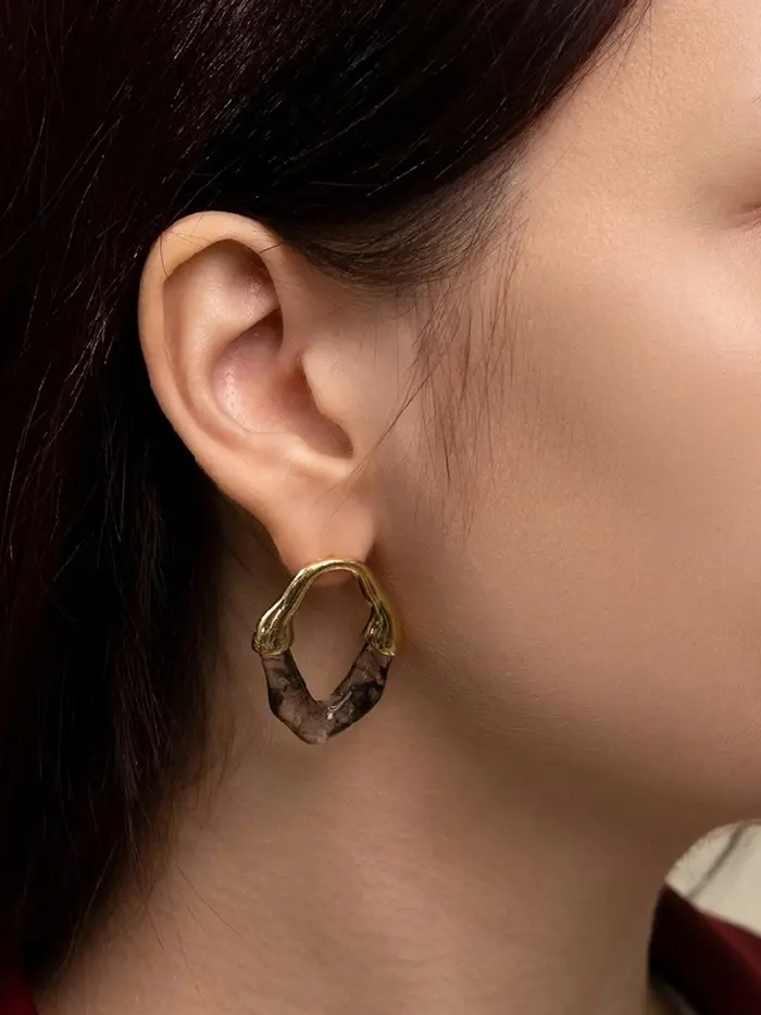Эти серьги словно воплощают тайны подземных пещер — прозрачный чёрный акрил с золотистой фурнитурой напоминает затейливые сталактиты, мерцающие в полумраке. Их длина в 3,5 см идеально сочетается с выразительностью и легкостью, создавая акцент, который не перегружает образ, но делает его уникальным и загадочным.