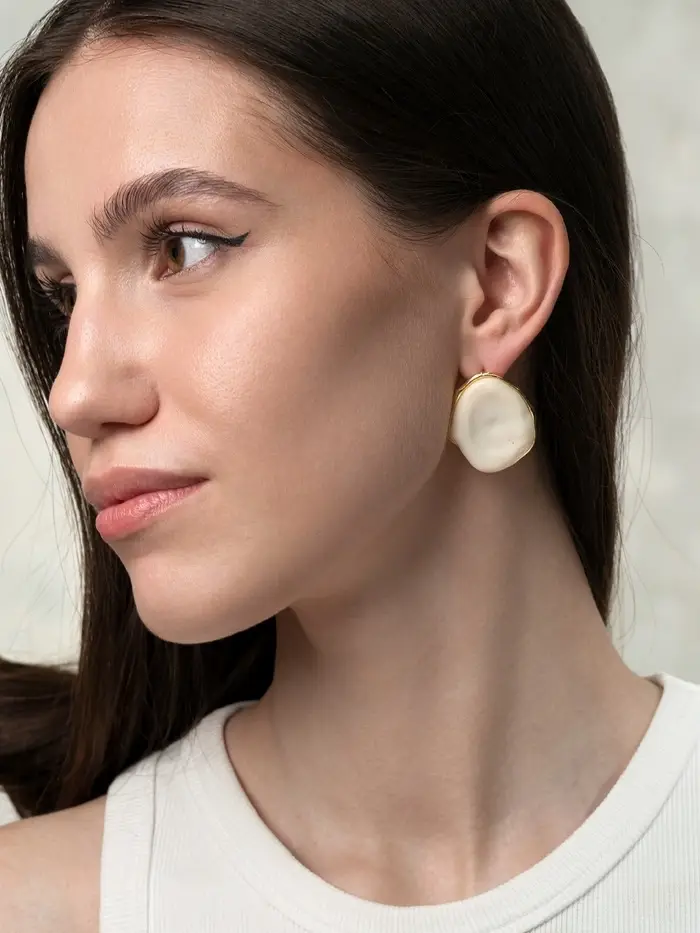 - Яркий визуальный акцент: сочетание белого цвета и золотистой фурнитуры делает серьги универсальным дополнением к разным стилям — от классики до современного уличного образа.