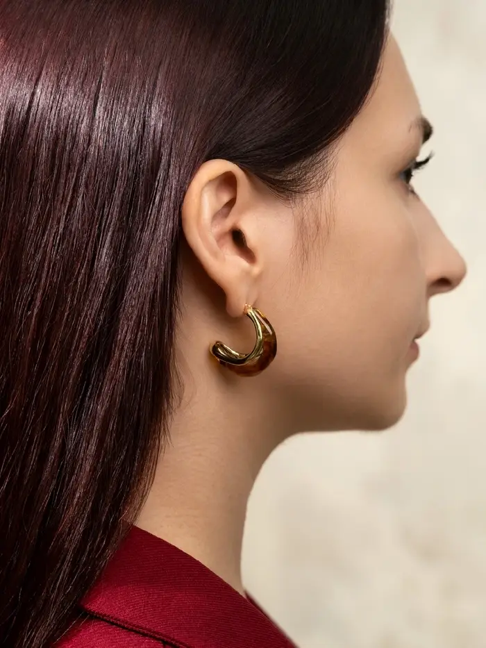Эти серьги из акрила привлекают внимание своей насыщенной коричневой палитрой, вплетённой в изящный полукруглый дизайн. Контраст золотистой фурнитуры с глубиной оттенка акрила создаёт эффект натурального камня с яркой живостью, что придаёт образу выразительность и теплоту. Идеальный выбор для женщины, которая ценит стиль и оригинальность без лишней вычурности.