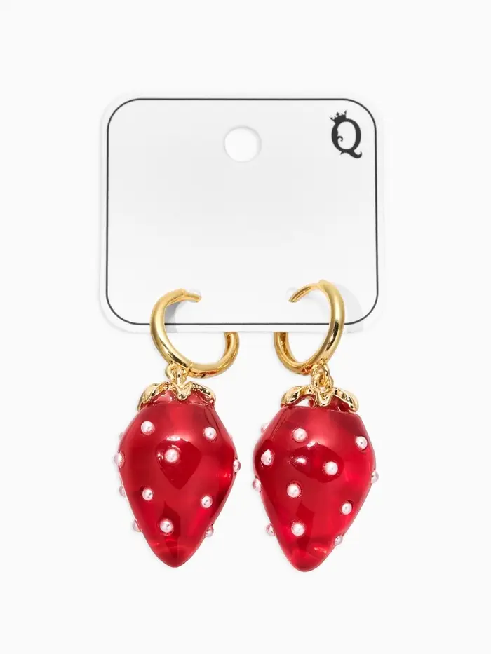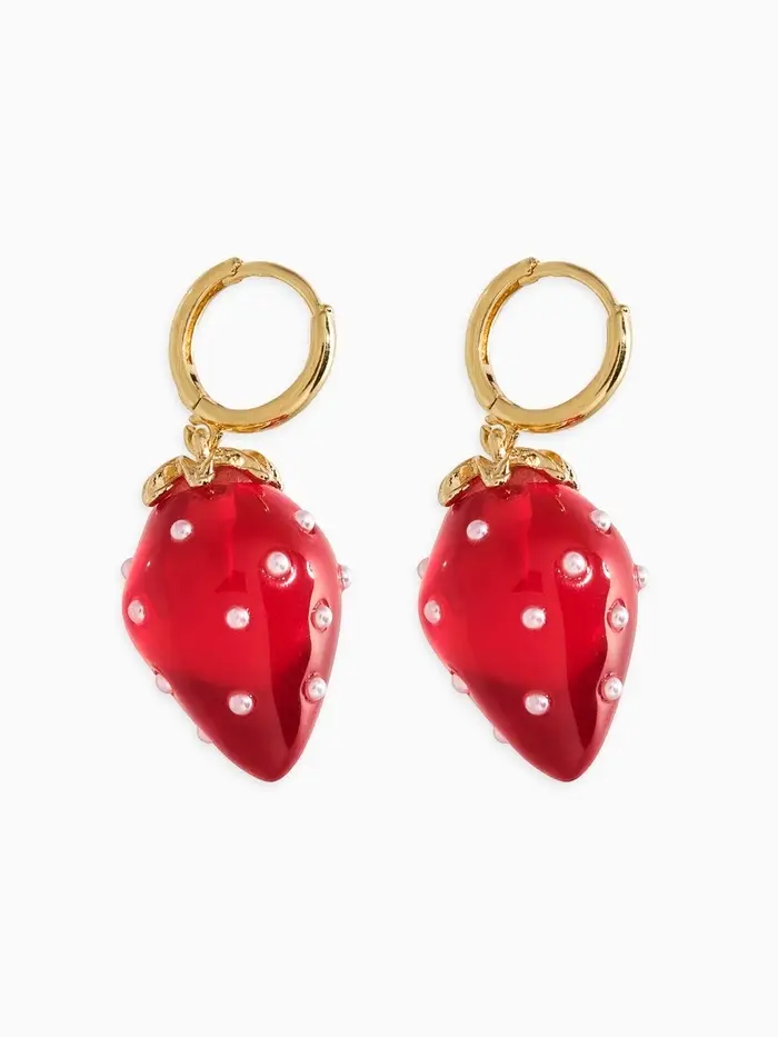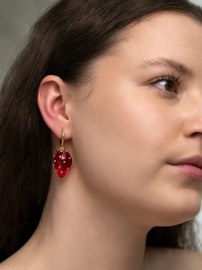 Яркая красота сплетённой с летним настроением — так можно охарактеризовать эти серьги конго с выразительным красным оттенком и стилем, вдохновлённым сочной клубникой в крапинку. Акриловые вставки придают украшению живость и оригинальность, а золотистый оттенок фурнитуры создаёт эффектный контраст, подчёркивая индивидуальность и энергетику обладательницы.