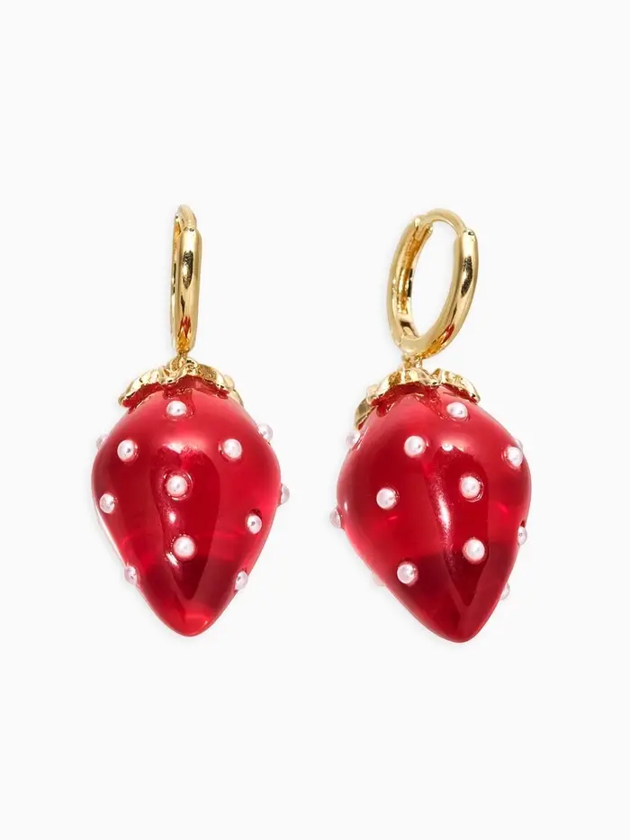 Серьги "Клубничка на кольце" в крапинку, цвет красный в золоте