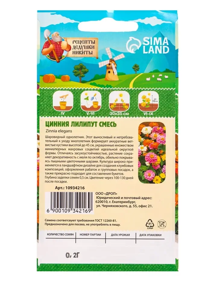 Семена цветов Цинния «Лилипут» смесь, 0.2 г, «Рецепты дедушки Никиты»
