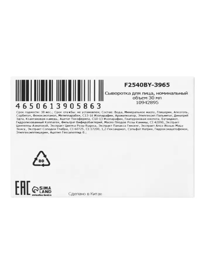 Вода, Минеральное масло, Глицерин, Алкоголь, Сорбитол, Феноксиэтанол, Метилпарабен, C13-16 Изопарафин, Ароматизатор, Этилгексил Пальмитат, Динатрий Эдта, Ксантановая камедь, Ацетат Токоферила, C10-13 Изопарафин, Гиалуроновая кислота, Бутандиол, Гидролизованный Коллаген, Фильтрат Бифидобактерий, Масло Плодов Розы Канины, CI 42090, Экстракт Центеллы Азиатской, Экстракт Цветка Розы Rugosa, Экстракт Панакса Гинсенг, Экстракт Алоэ Йохью Мацу Экису, Экстракт Солодки Глабра, CI 60725, CI 17200, 1,2-Гександиол, Сульфат Натрия, Гидроксиацетофенон, Этилгексилглицерин, Ацетил Гексапептид-8.