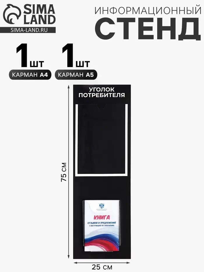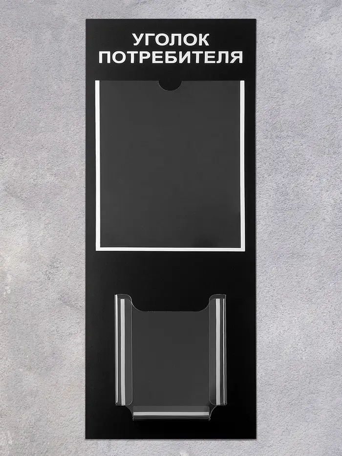 Представляем уникальное средство визуализации важной информации — компактный стенд с двумя удобными карманами разного формата. Черный корпус с белым шрифтом привлекает внимание и гарантирует простоту восприятия данных.