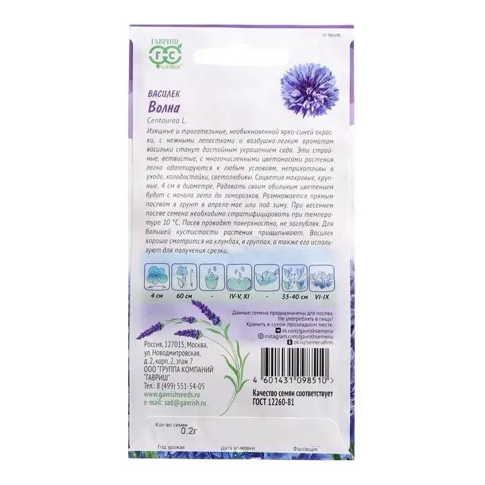 Семена цветов Василек "Волна", ц/п, 0,2 г