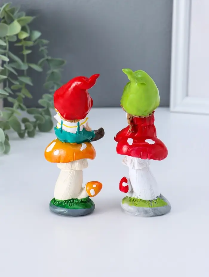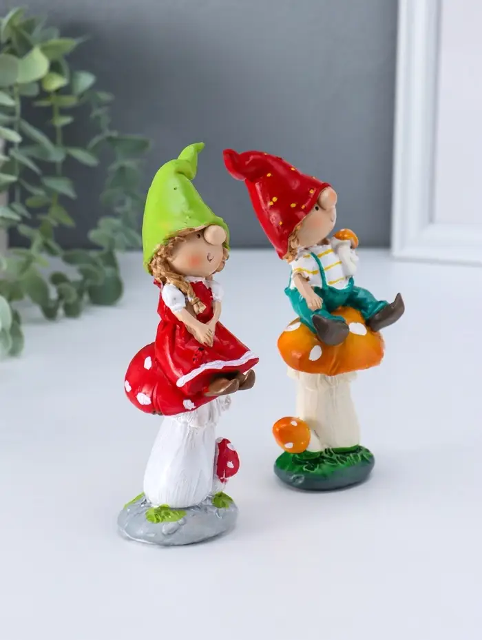 Сувенир полистоун "Малыши в длинных колпаках на мухоморах" набор 2 шт 4х5,5х14,2 см