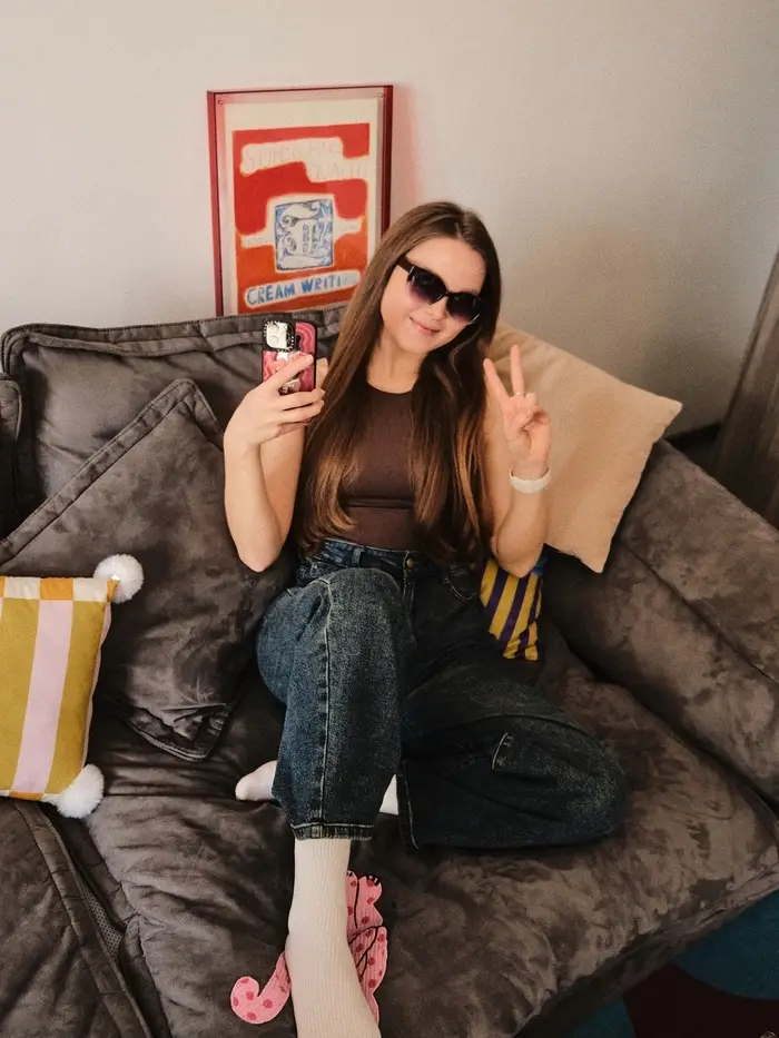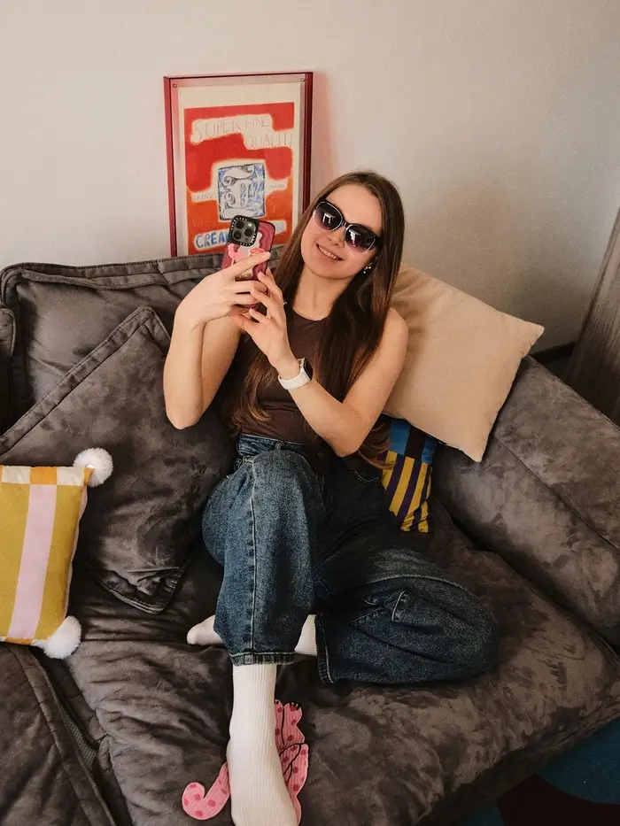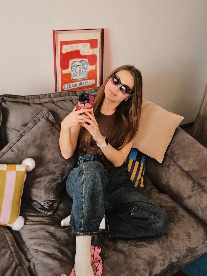 Черная полноободковая оправа из легкого пластика обрамляет линзы, создавая идеальный контраст и подчеркивая архитектуру лица. Этот аксессуар не просто дополняет образ, он становится его центральным элементом, привнося нотку утонченной экспрессии в повседневный или вечерний наряд.