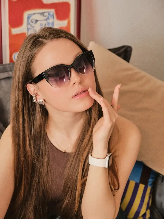 - Эталон стиля: форма «кошачий глаз» визуально приподнимает линию скул, придавая лицу более молодой и подтянутый вид.