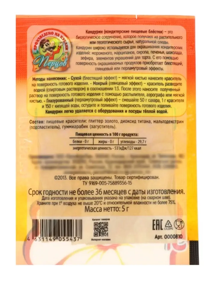 - Экономичный расход: Вес упаковки всего 5 граммов, но этого количества хватит на декорирование 20–30 яиц или большой партии капкейков. Порошок очень легкий, для покрытия требуется совсем немного.