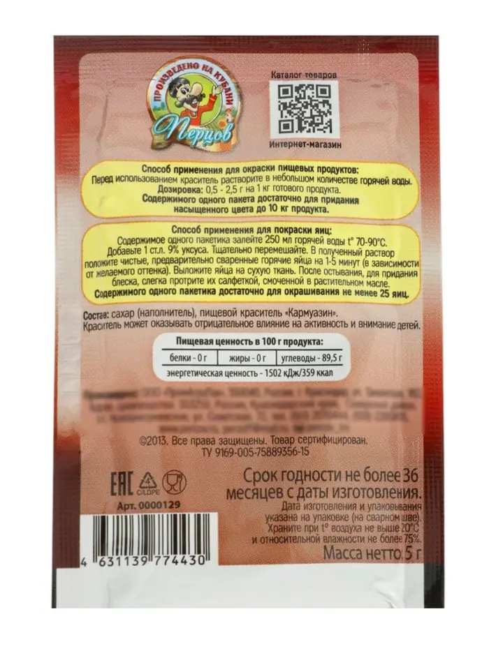- Экономичный сухой порошок: Вес пакетика всего 5 граммов, но этого количества хватит на окрашивание 15–20 яиц. Сухая форма удобна для хранения — порошок не портится и занимает минимум места на кухне.