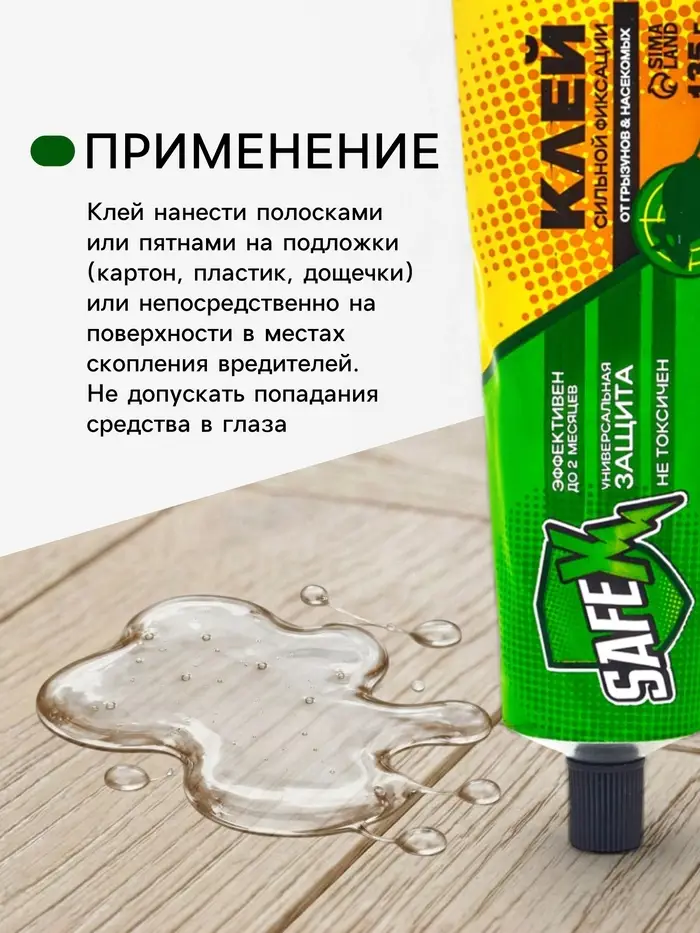 Клей SAFEX - это простое и эффективное средство для борьбы с грызунами и насекомыми без использования ядов. Он создает липкую ловушку, которая надежно удерживает вредителей на поверхности.