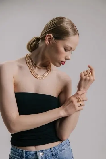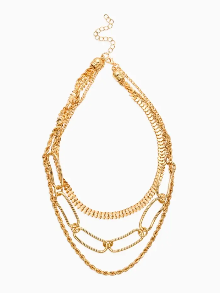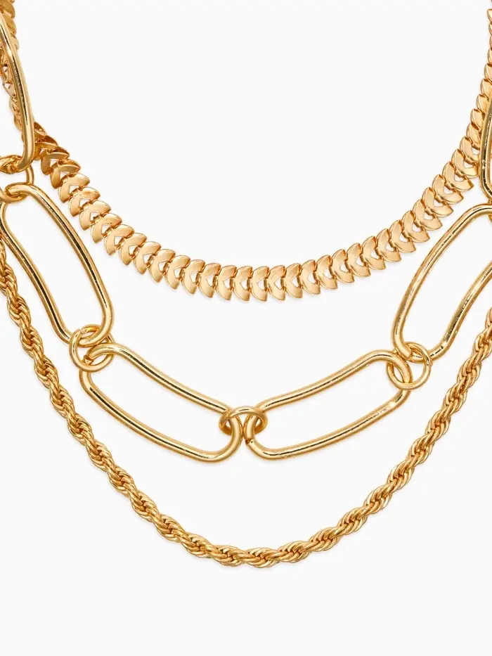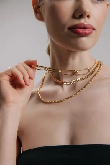 Три цепи золотистого цвета разной длины образуют гармоничный многослойный ансамбль, который выделяется своей утончённостью и лаконичностью. Чистота формы и отсутствие вставок подчёркивают минималистичный дизайн, делая украшение универсальным акцентом для любых образов. Стандартный карабин надёжно фиксирует украшение, обеспечивая лёгкость эксплуатации и комфорт в повседневной жизни.