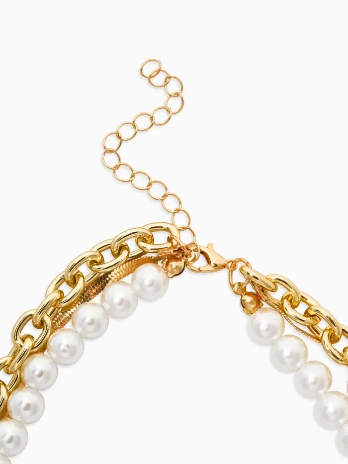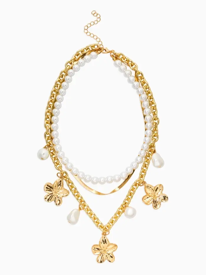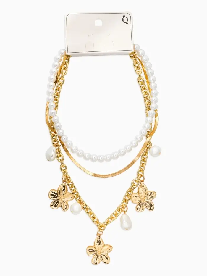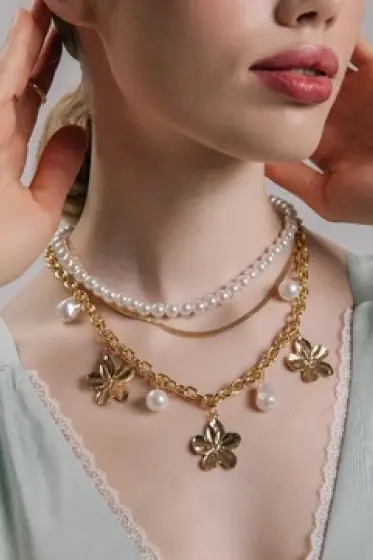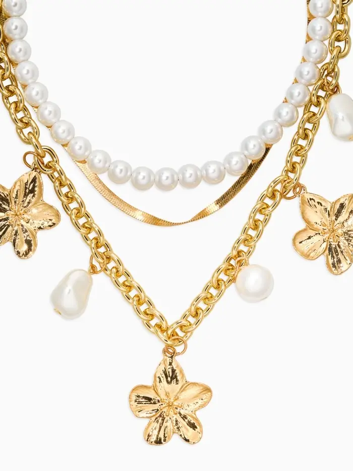 Композиция аксессуара продумана до мелочей: три уровня цепочек разной длины: пластиковые бусины под жемчуг 34 см, минималистичная цепочка 36 см и цепь с подвесками 40 см. Колье идеально ложится, подчеркивая линию декольте. Каскад из золотистой фурнитуры, россыпи белоснежных бусин и изящных цветочных и белоснежных подвесок создает романтичное настроение и придает образу особую легкость.