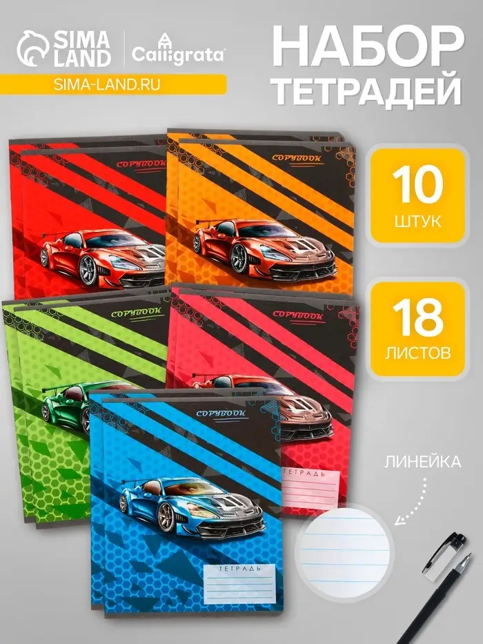 Комплект тетрадей из 10 штук, 18 листов в линию Calligrata "Тачки", обложка мелованный картон, ВД-лак, блок офсет, 5 видов по 2 штуки