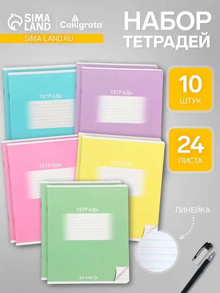 Комплект тетрадей из 10 штук, 24 листа в линию Calligrata "Школьная", обложка мелованный картон, ВД-лак, блок офсет, 5 видов по 2 штуки