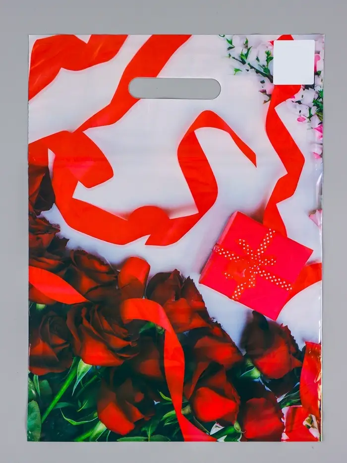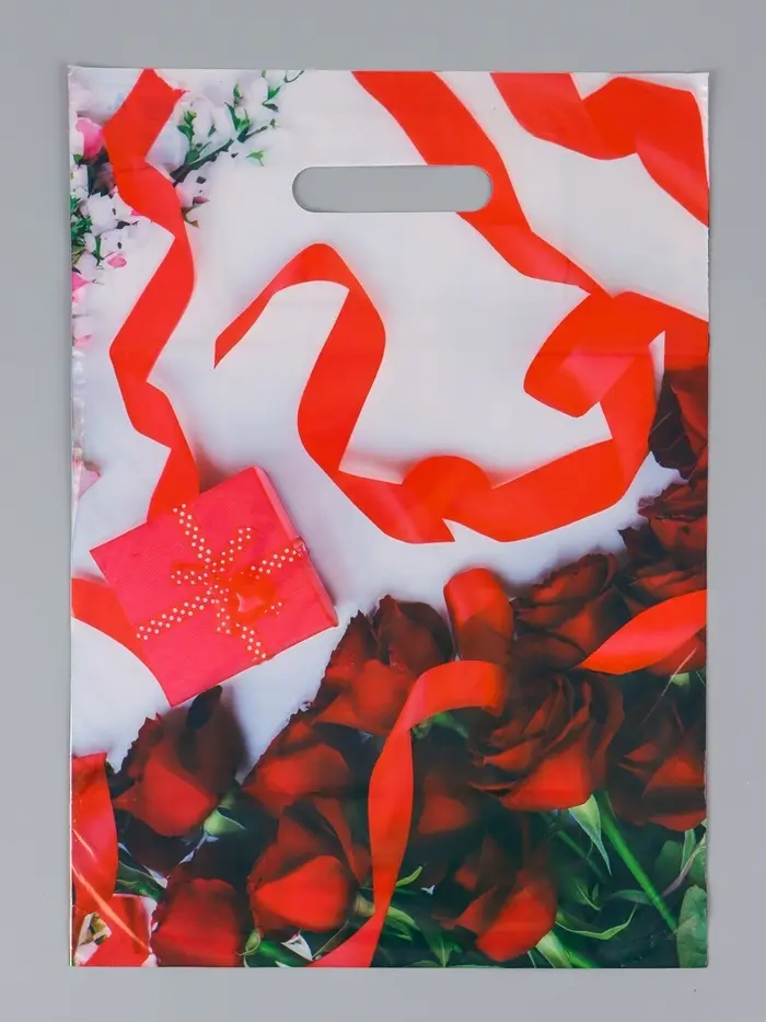 - Традиционный праздничный дизайн: Яркий красный фон с цветочными элементами и тематической надписью однозначно указывает на назначение пакета. Дизайн ориентирован на подарки женщинам и девочкам на 8 Марта, 14 Февраля и другие особые поводы.