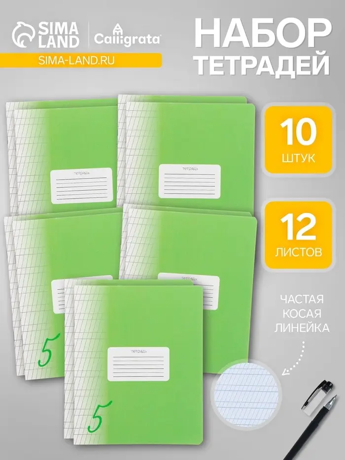 Комплект тетрадей из 10 штук, 12 листов в частую косую линию Calligrata "Пятёрка. Зелёная", обложка мелованный картон, блок офсет