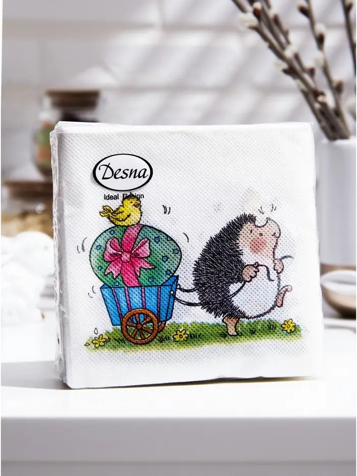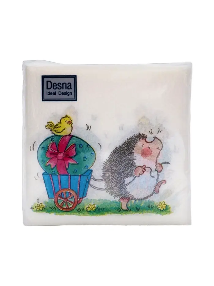 Пасхальные сервировочные бумажные салфетки Desna Design с рисунком «Веселый ёжик» - это отличное украшение для вашего праздничного стола. Идеально подойдут как для сервировки, так и в качестве декора и украшения в домашних условиях или на больших мероприятиях. Праздничные салфетки с пасхальным рисунком будут хорошим подарком для родных и близких. Данные салфетки можно использовать так же для декупажа и коллажей.