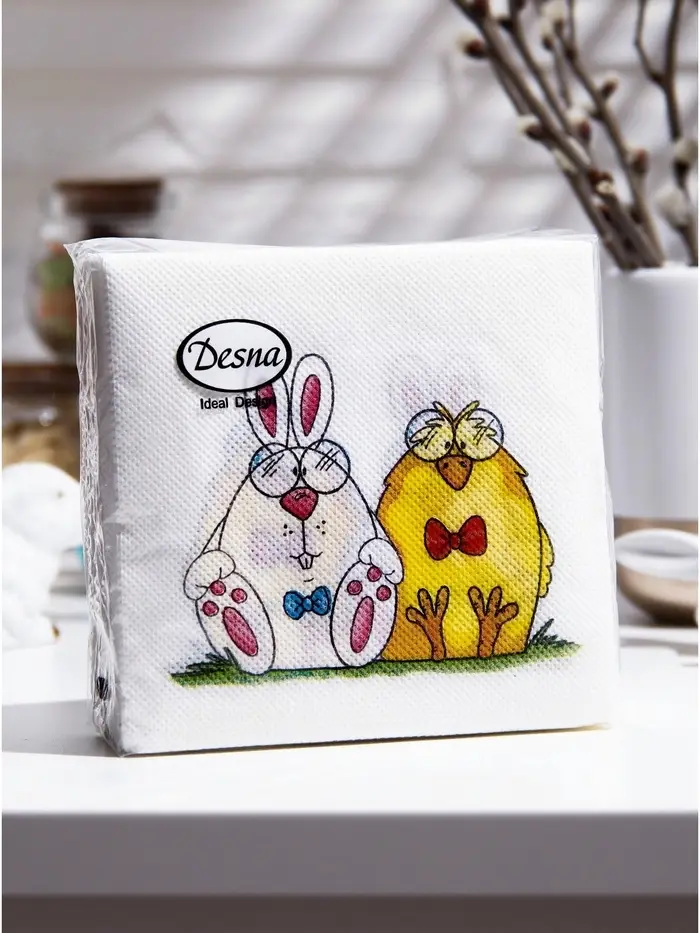 Пасхальные сервировочные бумажные салфетки Desna Design с рисунком «Сладкая парочка» - это отличное украшение для вашего праздничного стола. Идеально подойдут как для сервировки, так и в качестве декора и украшения в домашних условиях или на больших мероприятиях. Праздничные салфетки с пасхальным рисунком будут хорошим подарком для родных и близких. Данные салфетки можно использовать так же для декупажа и коллажей.