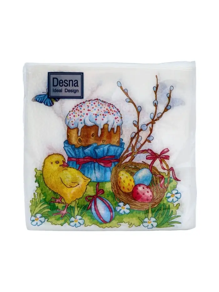 Пасхальные сервировочные бумажные салфетки Desna Design с рисунком «Пасха» - это отличное украшение для вашего праздничного стола. Идеально подойдут как для сервировки, так и в качестве декора и украшения в домашних условиях или на больших мероприятиях. Праздничные салфетки с пасхальным рисунком будут хорошим подарком для родных и близких. Данные салфетки можно использовать так же для декупажа и коллажей.