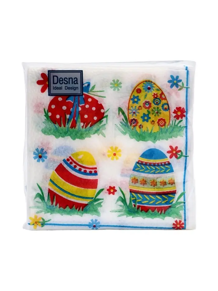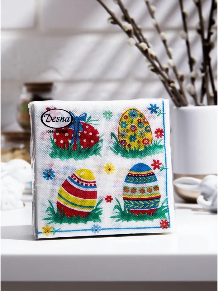 Пасхальные сервировочные бумажные салфетки Desna Design с рисунком «Пасхальные яйца» - это отличное украшение для вашего праздничного стола. Идеально подойдут как для сервировки, так и в качестве декора и украшения в домашних условиях или на больших мероприятиях. Праздничные салфетки с пасхальным рисунком будут хорошим подарком для родных и близких. Данные салфетки можно использовать так же для декупажа и коллажей.