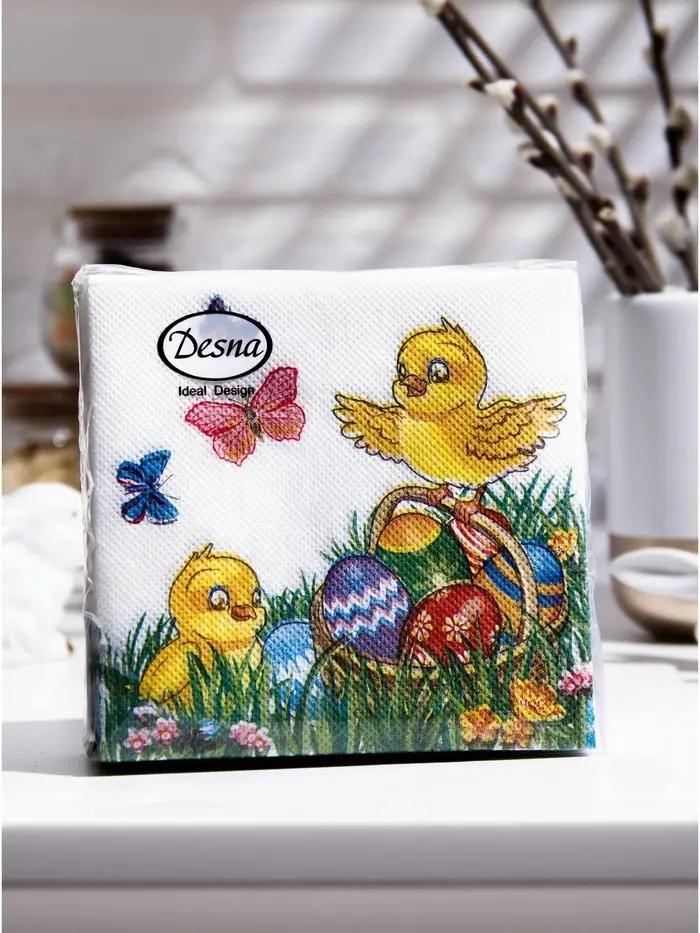Пасхальные сервировочные бумажные салфетки Desna Design с рисунком «Цыплята» - это отличное украшение для вашего праздничного стола. Идеально подойдут как для сервировки, так и в качестве декора и украшения в домашних условиях или на больших мероприятиях. Праздничные салфетки с пасхальным рисунком будут хорошим подарком для родных и близких. Данные салфетки можно использовать так же для декупажа и коллажей.