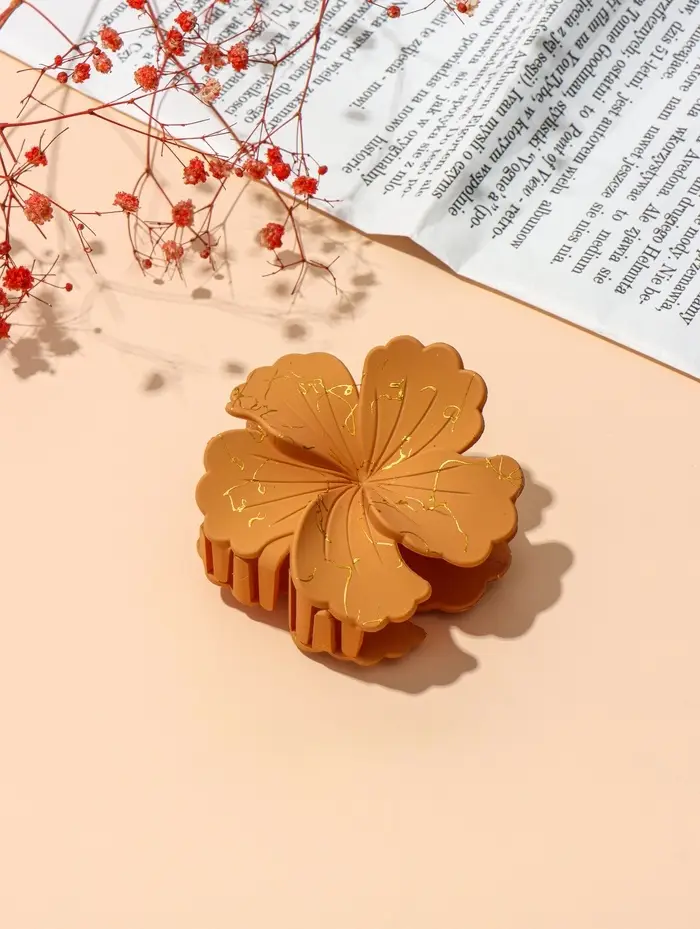 - Дизайн в виде цветка: Аксессуар выполнен в форме стилизованного бутона. Матовая поверхность выглядит современно, не бликует на солнце и не собирает отпечатки пальцев. Такой зажим подчеркивает естественную красоту, не перегружая прическу.