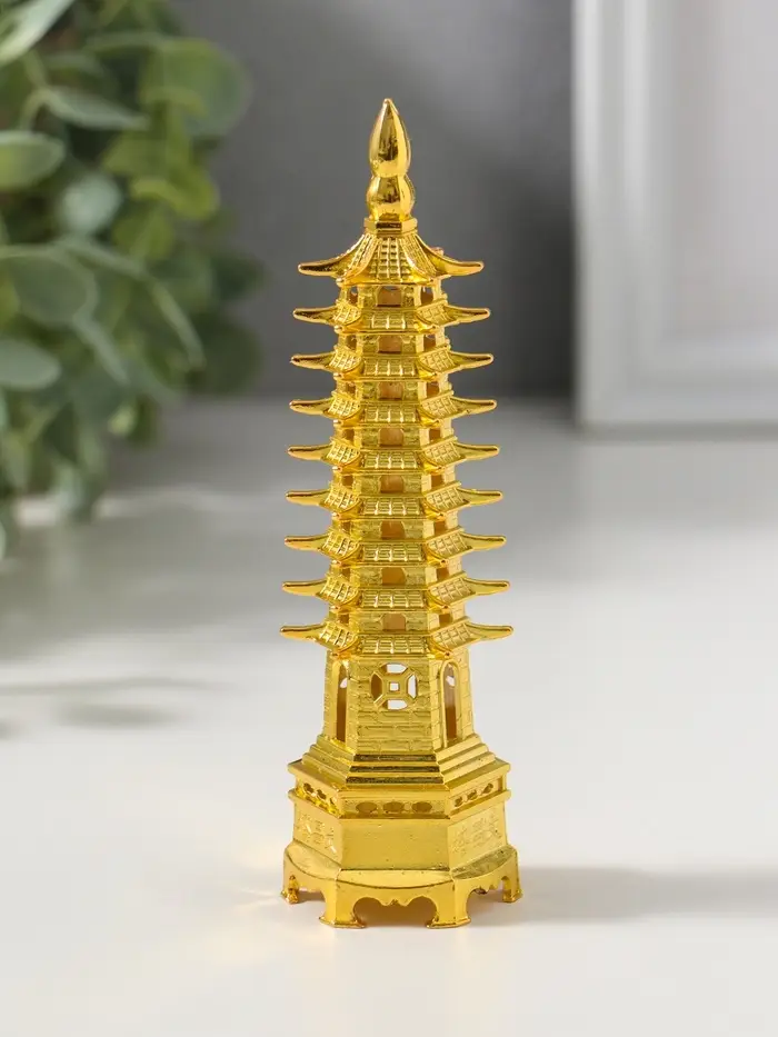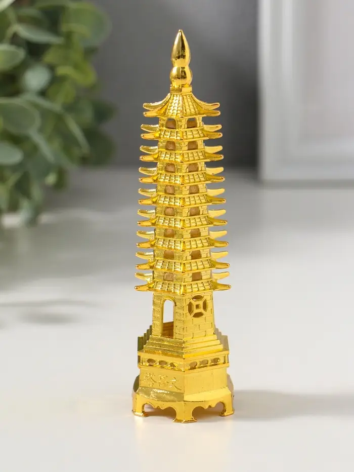 Эти золотые пагоды — больше, чем просто декор. Они хранят атмосферу мудрости и спокойствия, становясь немым напоминанием о вечных ценностях в повседневной суете. Пара изящных фигурок создаёт завершённую композицию для кабинета, библиотеки или гостиной, привнося элемент гармонии и утончённого восточного стиля.