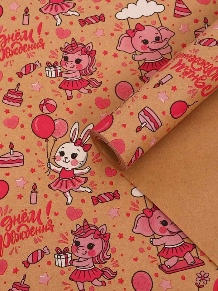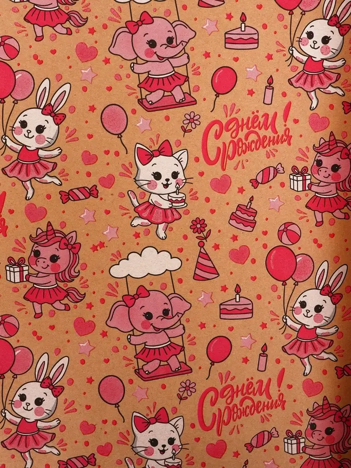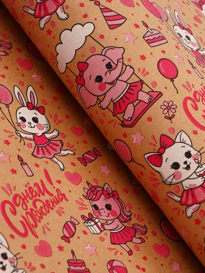 - Яркий праздничный дизайн: Бумага украшена розовым принтом с изображением воздушных шаров, конфетти, сердечек, звёзд, сказочных животных и поздравительной надписью. Такой дизайн универсален для детских и взрослых именин.