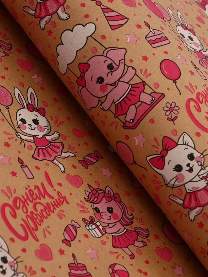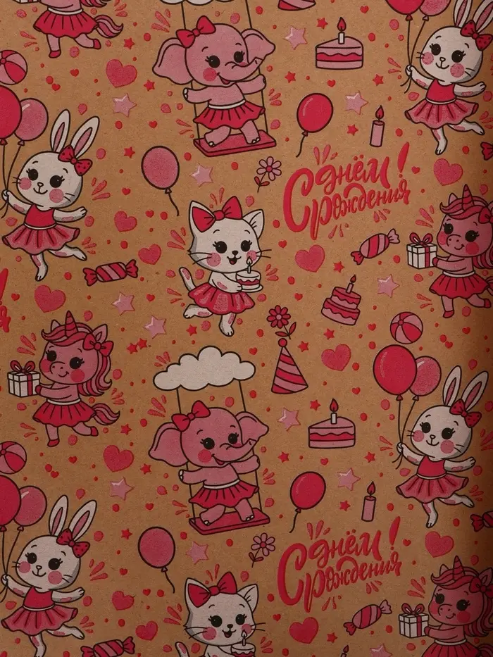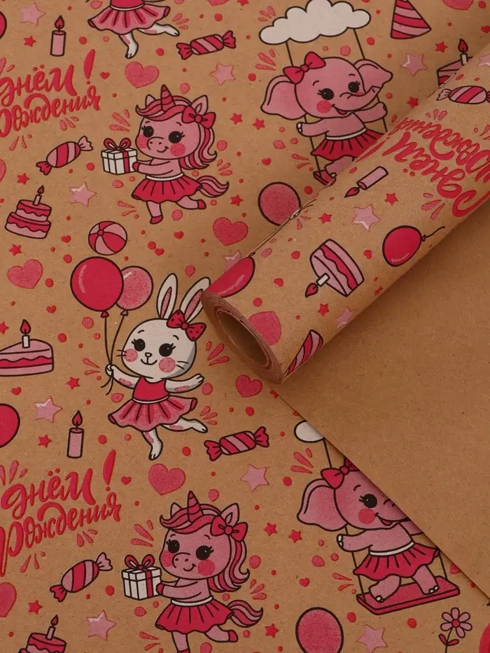 Бумага упаковочная крафт "С днём рождения!", белый/розовый, 0,7 х 10± 5% м, 60 гр