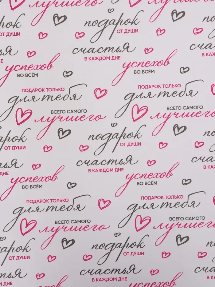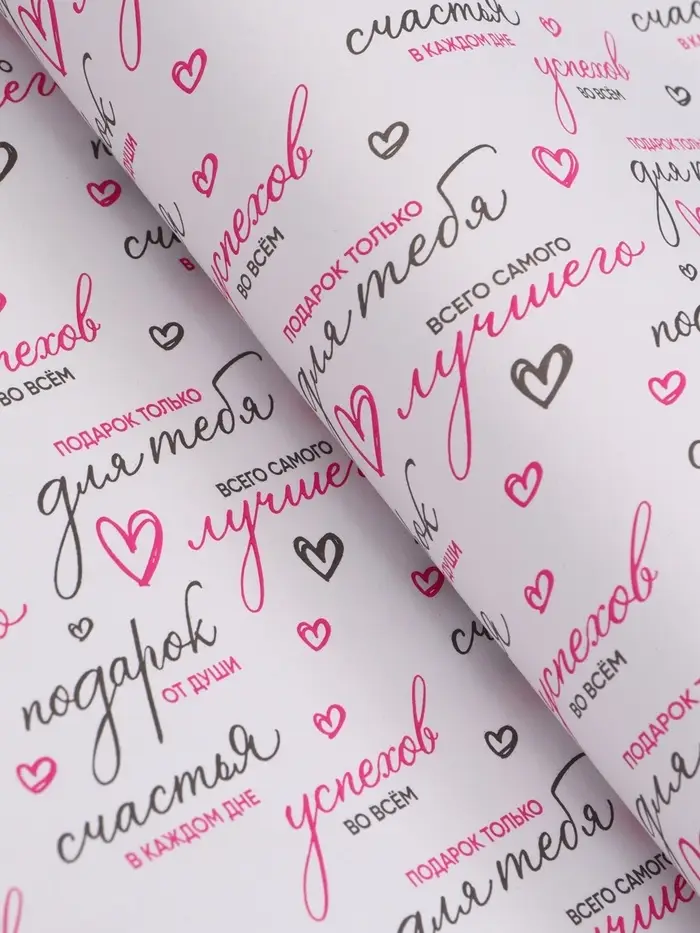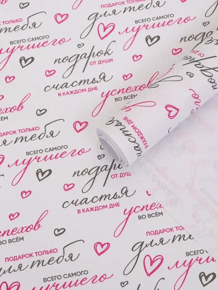 Бумага упаковочная крафт белый "Пожелания", черный/розовый, 0,7 х 10± 5% м, 60 гр