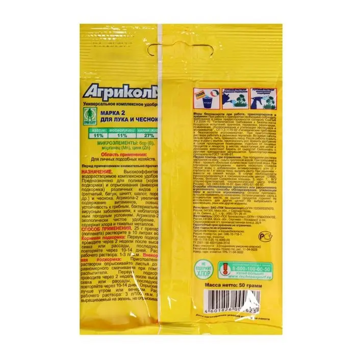 Чеснок: рекомендуется проводить 2-3 подкормки с интервалом 7-10 дней в период формирования зубков. 25 г удобрения при перемешивании растворите в 15 л воды и обработайте 15-30 кв. м. посадок в зависимости от способа обработки.