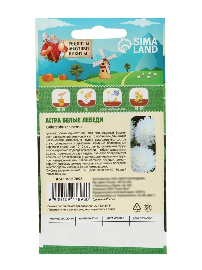 Астра однолетняя «Белые лебеди» – это элегантный сорт с крупными, густомахровыми соцветиями ослепительно-белого цвета. Изящные, стройные кусты с многочисленными цветами напоминают стаю прекрасных лебедей, застывших в саду. Идеальный выбор для срезки и создания романтичных цветников.