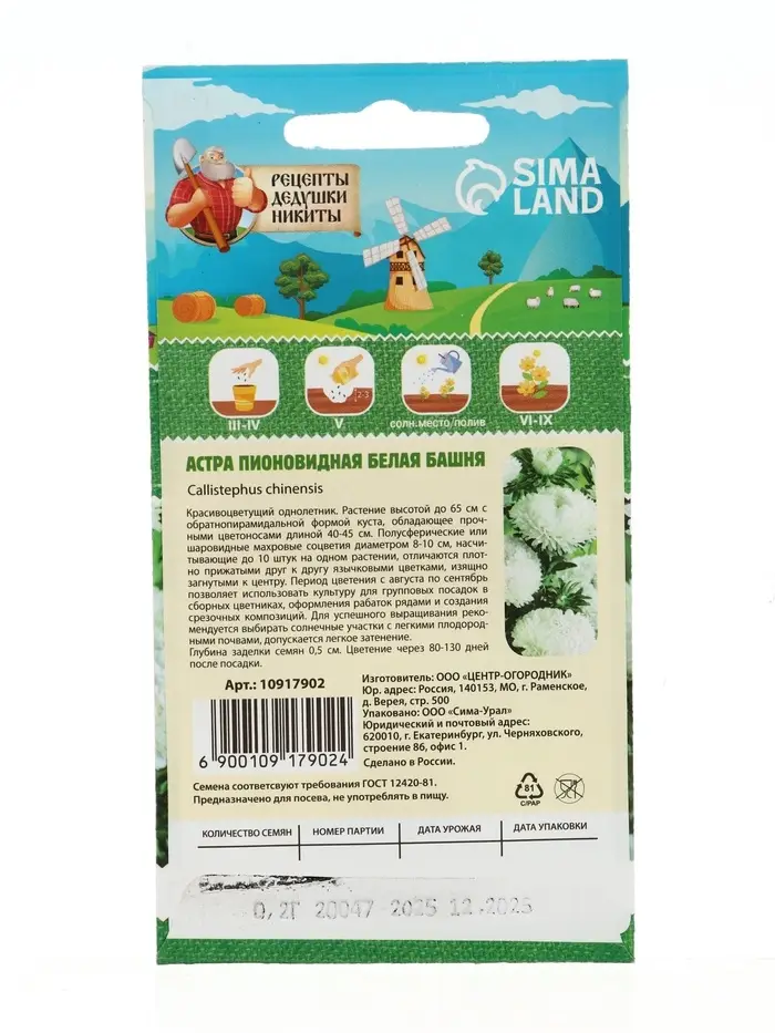 Семена цветов Астра пионовидная "Белая башня", 0,2 г