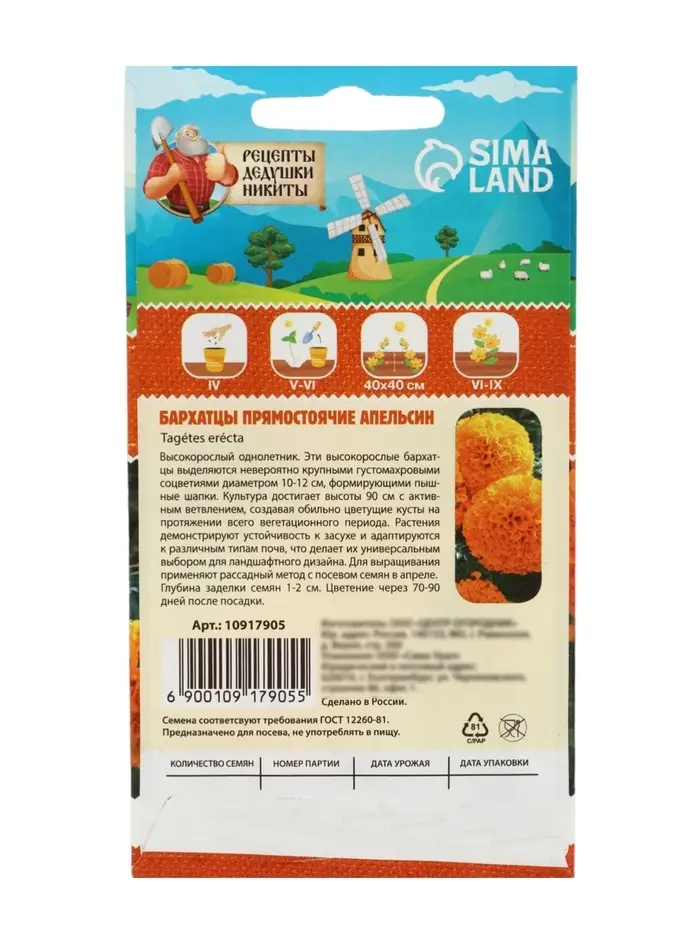 Семена цветов Бархатцы «Тайшан», оранжевые, Сем. Алт, ц/п, 5 шт.