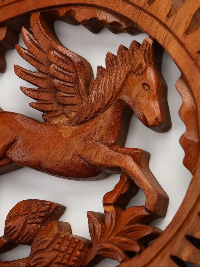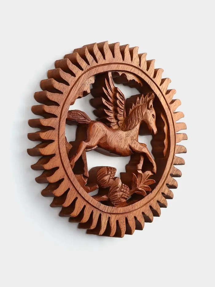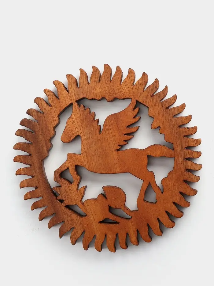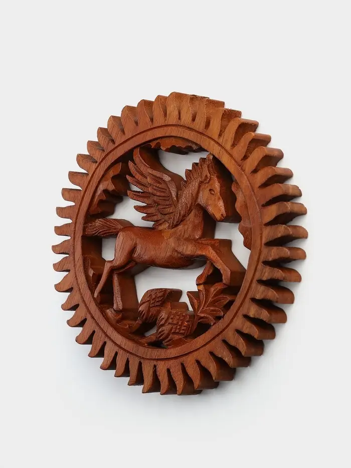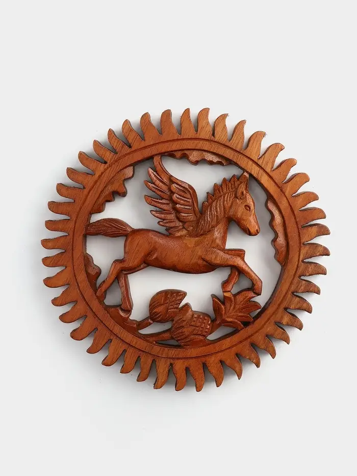 Пегас — мифический крылатый конь, символ вдохновения и полёта мысли. Это деревянное панно размером 20×20 см приносит в интерьер образ свободы и творчества. Силуэт животного, вырезанный из дерева суар, создаёт на стене игру света и тени, оживляя пространство без лишних цветовых акцентов. Подвесная система позволяет легко закрепить его на любой вертикальной поверхности.