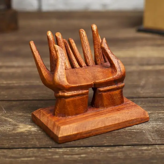 Индонезийские мастера изобразили руки, как символ заботы. Ведь даже существует поговорка «протянуть руку помощи», то есть подарить заботу ближнему своему. Преподнесите подставка под визитки «Символика», 9×9×10 см самому дорогому для Вас человеку, другу или партнёру в знак того, чтобы он всегда мог на Вас рассчитывать и полагаться. Ведь доверие очень дорого стоит!