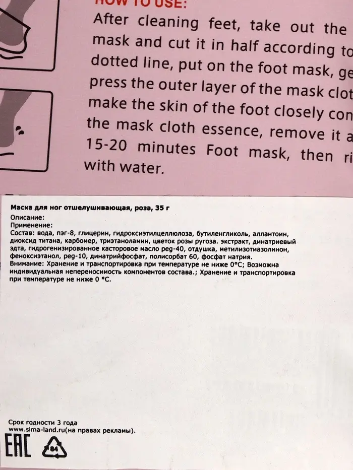 Наденьте маску-носки на чистые сухие ноги на 60–90 минут, затем смойте остатки средства. Через несколько дней кожа постепенно обновляется, становится мягкой, гладкой и ухоженной.