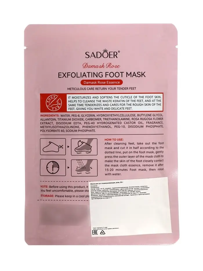 Маска предназначена для людей, которые хотят заботиться о красоте и здоровье кожи ног, устранять огрубевшие участки и поддерживать комфорт и мягкость стоп. Sadoer с розой подходит для всех типов кожи и идеально подходит для регулярного домашнего ухода.