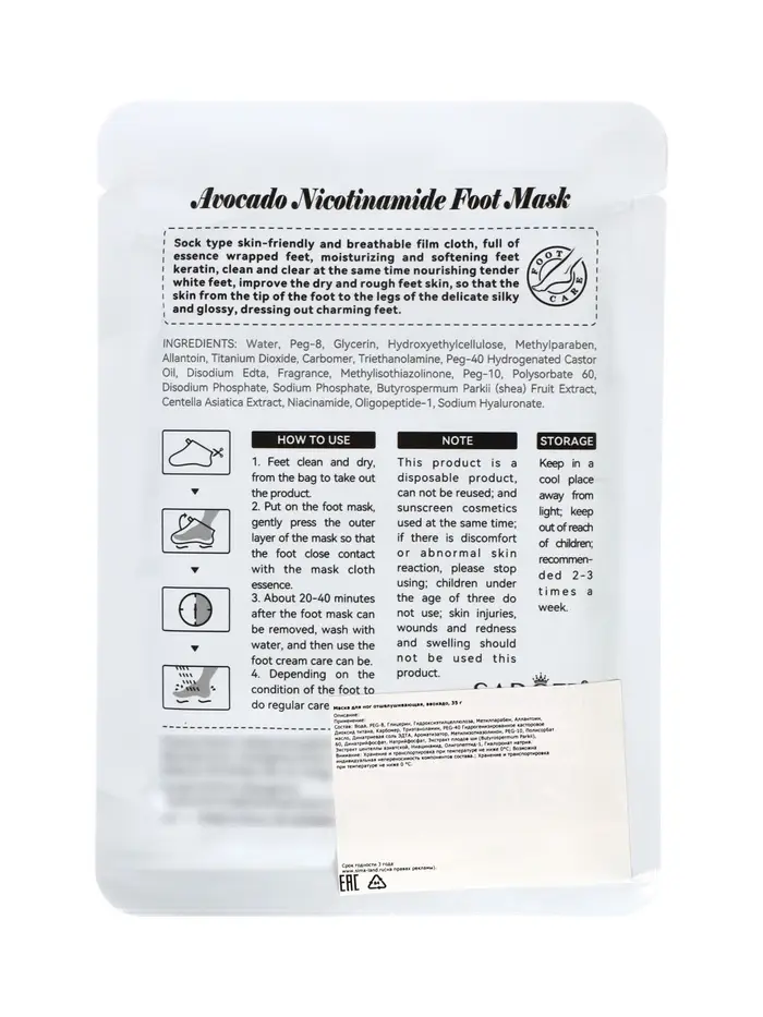 Маска предназначена для людей, которые хотят заботиться о здоровье и красоте кожи ног, устранять огрубевшие участки и поддерживать комфорт и мягкость стоп. Sadoer с авокадо подходит для всех типов кожи и идеально подходит для регулярного домашнего ухода.