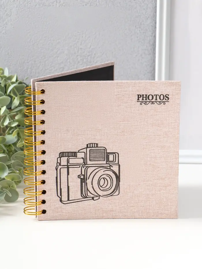 Фотоальбом 20 листов на спирали "Фотоаппарат. Беж" текстиль, чёрный картон 17,5х17,5 см
